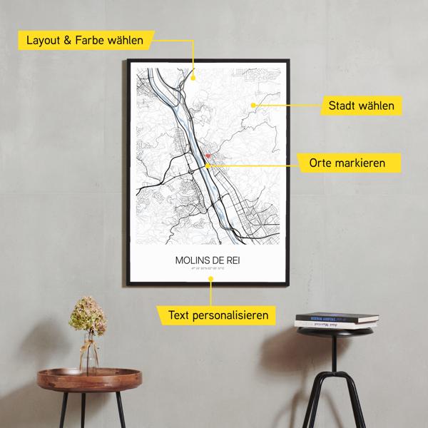 Wähle Farben und Layouts, die perfekt zu dir passen. Ob als klassische Karte in schwarz-weiß oder in modernen Farben. Bei Cartida kannst du ein Design in deinen Lieblingsfarben wählen. Erstelle eine Variante von Molins de Rei, die perfekt zu dir und deiner Wohnung passt.