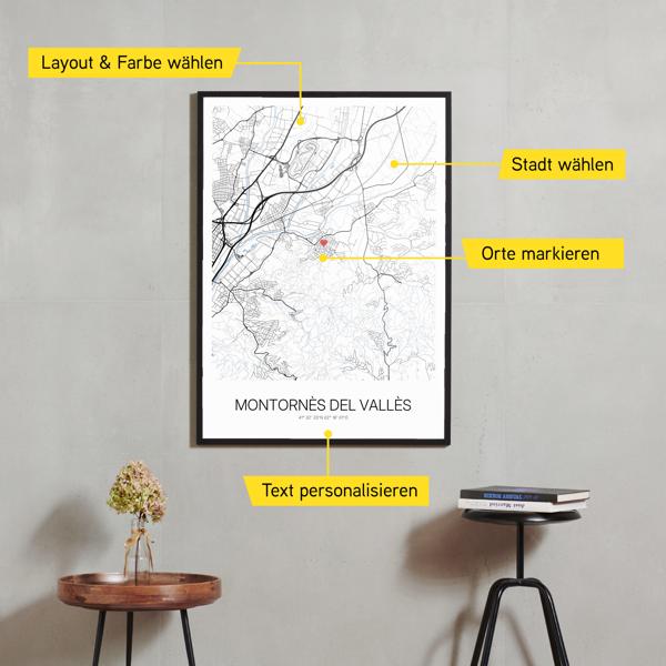 Wähle Farben und Layouts, die perfekt zu dir passen. Ob als klassische Karte in schwarz-weiß oder in modernen Farben. Bei Cartida kannst du ein Design in deinen Lieblingsfarben wählen. Erstelle eine Variante von Montornès del Vallès, die perfekt zu dir und deiner Wohnung passt.
