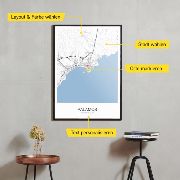 Wähle Farben und Layouts, die perfekt zu dir passen. Ob als klassische Karte in schwarz-weiß oder in modernen Farben. Bei Cartida kannst du ein Design in deinen Lieblingsfarben wählen. Erstelle eine Variante von Palamós, die perfekt zu dir und deiner Wohnung passt.