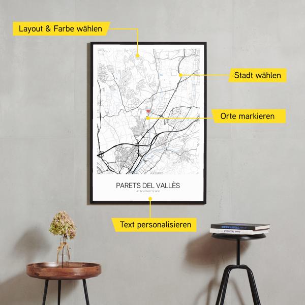 Wähle Farben und Layouts, die perfekt zu dir passen. Ob als klassische Karte in schwarz-weiß oder in modernen Farben. Bei Cartida kannst du ein Design in deinen Lieblingsfarben wählen. Erstelle eine Variante von Parets del Vallès, die perfekt zu dir und deiner Wohnung passt.