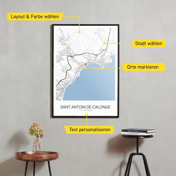 Wähle Farben und Layouts, die perfekt zu dir passen. Ob als klassische Karte in schwarz-weiß oder in modernen Farben. Bei Cartida kannst du ein Design in deinen Lieblingsfarben wählen. Erstelle eine Variante von Sant Antoni de Calonge, die perfekt zu dir und deiner Wohnung passt.
