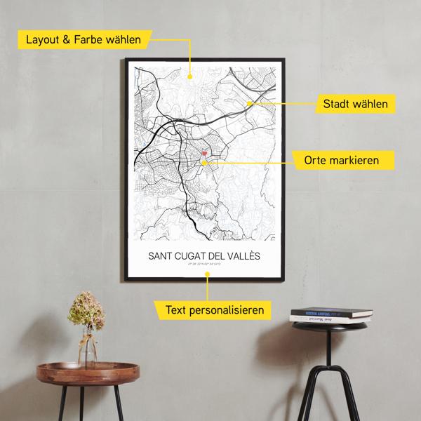 Wähle Farben und Layouts, die perfekt zu dir passen. Ob als klassische Karte in schwarz-weiß oder in modernen Farben. Bei Cartida kannst du ein Design in deinen Lieblingsfarben wählen. Erstelle eine Variante von Sant Cugat del Vallès, die perfekt zu dir und deiner Wohnung passt.