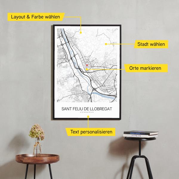 Wähle Farben und Layouts, die perfekt zu dir passen. Ob als klassische Karte in schwarz-weiß oder in modernen Farben. Bei Cartida kannst du ein Design in deinen Lieblingsfarben wählen. Erstelle eine Variante von Sant Feliu de Llobregat, die perfekt zu dir und deiner Wohnung passt.
