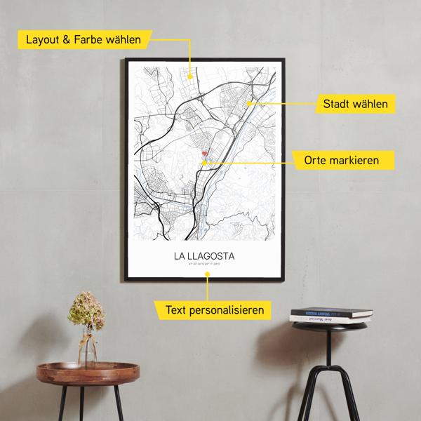 Wähle Farben und Layouts, die perfekt zu dir passen. Ob als klassische Karte in schwarz-weiß oder in modernen Farben. Bei Cartida kannst du ein Design in deinen Lieblingsfarben wählen. Erstelle eine Variante von la Llagosta, die perfekt zu dir und deiner Wohnung passt.