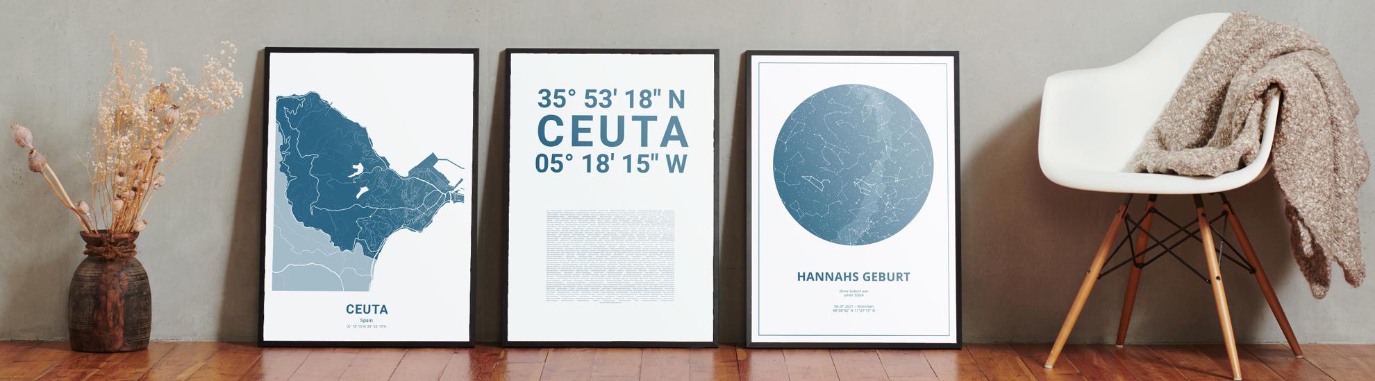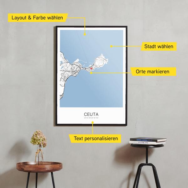 Wähle Farben und Layouts, die perfekt zu dir passen. Ob als klassische Karte in schwarz-weiß oder in modernen Farben. Bei Cartida kannst du ein Design in deinen Lieblingsfarben wählen. Erstelle eine Variante von Ceuta, die perfekt zu dir und deiner Wohnung passt.