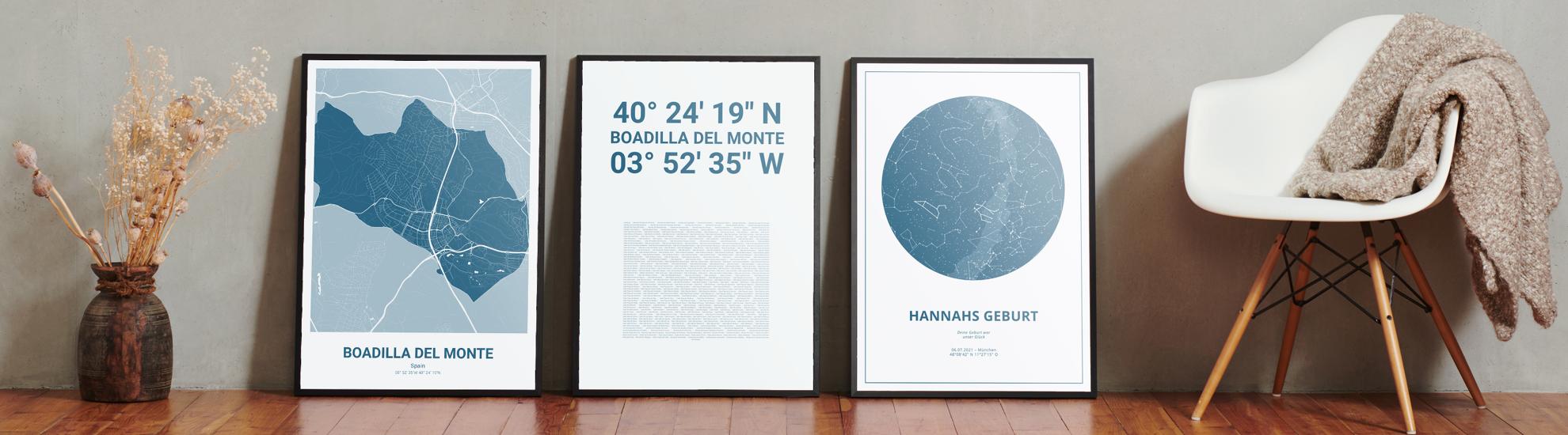 Wähle Farben und Layouts, die perfekt zu dir passen. Ob als klassische Karte in schwarz-weiß oder in modernen Farben. Bei Cartida kannst du ein Design in deinen Lieblingsfarben wählen. Erstelle eine Variante von Boadilla del Monte, die perfekt zu dir und deiner Wohnung passt.