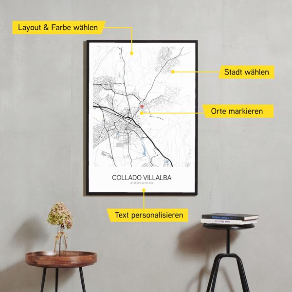 Wähle Farben und Layouts, die perfekt zu dir passen. Ob als klassische Karte in schwarz-weiß oder in modernen Farben. Bei Cartida kannst du ein Design in deinen Lieblingsfarben wählen. Erstelle eine Variante von Collado Villalba, die perfekt zu dir und deiner Wohnung passt.