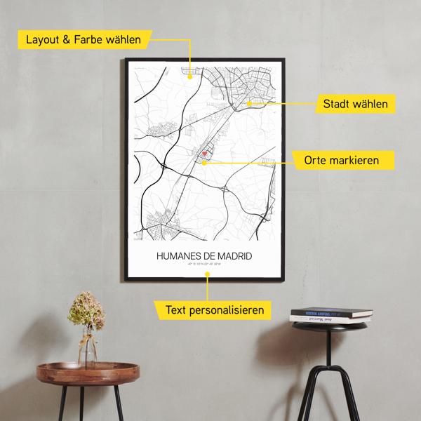 Wähle Farben und Layouts, die perfekt zu dir passen. Ob als klassische Karte in schwarz-weiß oder in modernen Farben. Bei Cartida kannst du ein Design in deinen Lieblingsfarben wählen. Erstelle eine Variante von Humanes de Madrid, die perfekt zu dir und deiner Wohnung passt.