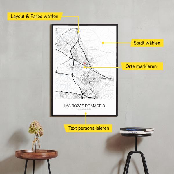 Wähle Farben und Layouts, die perfekt zu dir passen. Ob als klassische Karte in schwarz-weiß oder in modernen Farben. Bei Cartida kannst du ein Design in deinen Lieblingsfarben wählen. Erstelle eine Variante von Las Rozas de Madrid, die perfekt zu dir und deiner Wohnung passt.