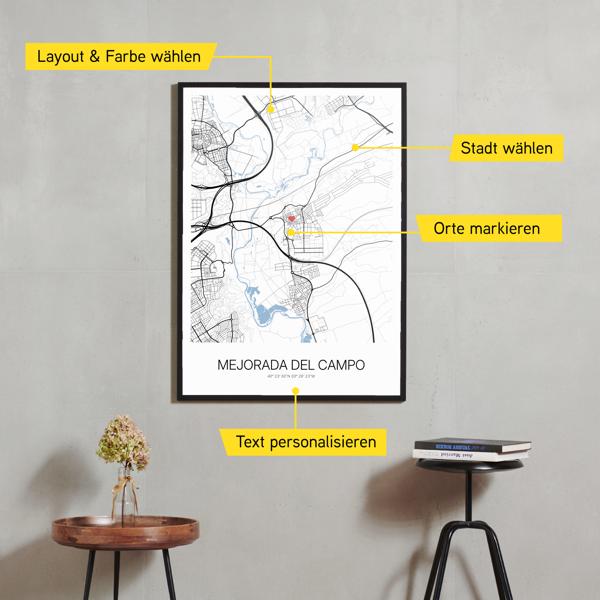 Wähle Farben und Layouts, die perfekt zu dir passen. Ob als klassische Karte in schwarz-weiß oder in modernen Farben. Bei Cartida kannst du ein Design in deinen Lieblingsfarben wählen. Erstelle eine Variante von Mejorada del Campo, die perfekt zu dir und deiner Wohnung passt.
