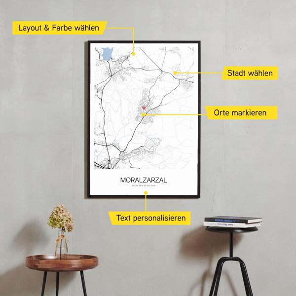 Wähle Farben und Layouts, die perfekt zu dir passen. Ob als klassische Karte in schwarz-weiß oder in modernen Farben. Bei Cartida kannst du ein Design in deinen Lieblingsfarben wählen. Erstelle eine Variante von Moralzarzal, die perfekt zu dir und deiner Wohnung passt.