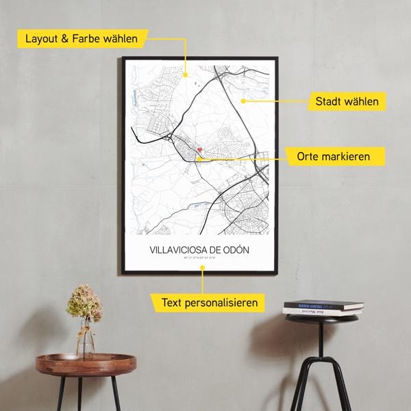 Wähle Farben und Layouts, die perfekt zu dir passen. Ob als klassische Karte in schwarz-weiß oder in modernen Farben. Bei Cartida kannst du ein Design in deinen Lieblingsfarben wählen. Erstelle eine Variante von Villaviciosa de Odón, die perfekt zu dir und deiner Wohnung passt.