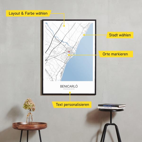 Wähle Farben und Layouts, die perfekt zu dir passen. Ob als klassische Karte in schwarz-weiß oder in modernen Farben. Bei Cartida kannst du ein Design in deinen Lieblingsfarben wählen. Erstelle eine Variante von Benicarló, die perfekt zu dir und deiner Wohnung passt.