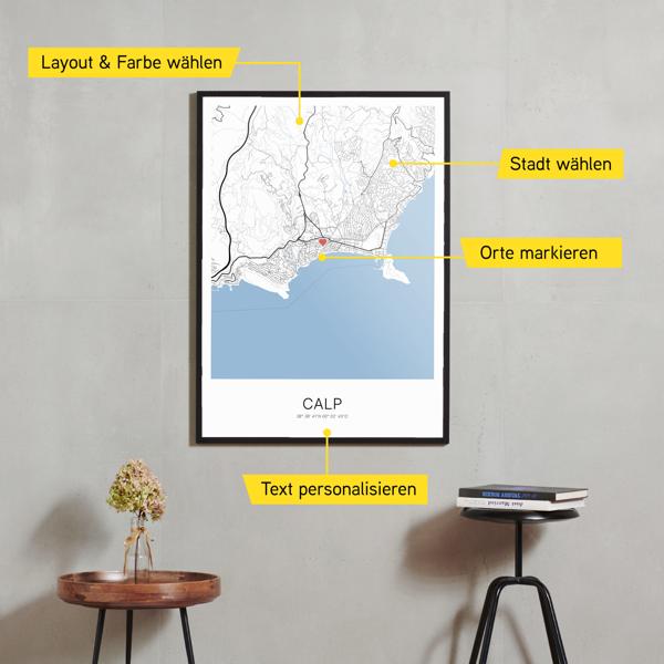 Wähle Farben und Layouts, die perfekt zu dir passen. Ob als klassische Karte in schwarz-weiß oder in modernen Farben. Bei Cartida kannst du ein Design in deinen Lieblingsfarben wählen. Erstelle eine Variante von Calp, die perfekt zu dir und deiner Wohnung passt.