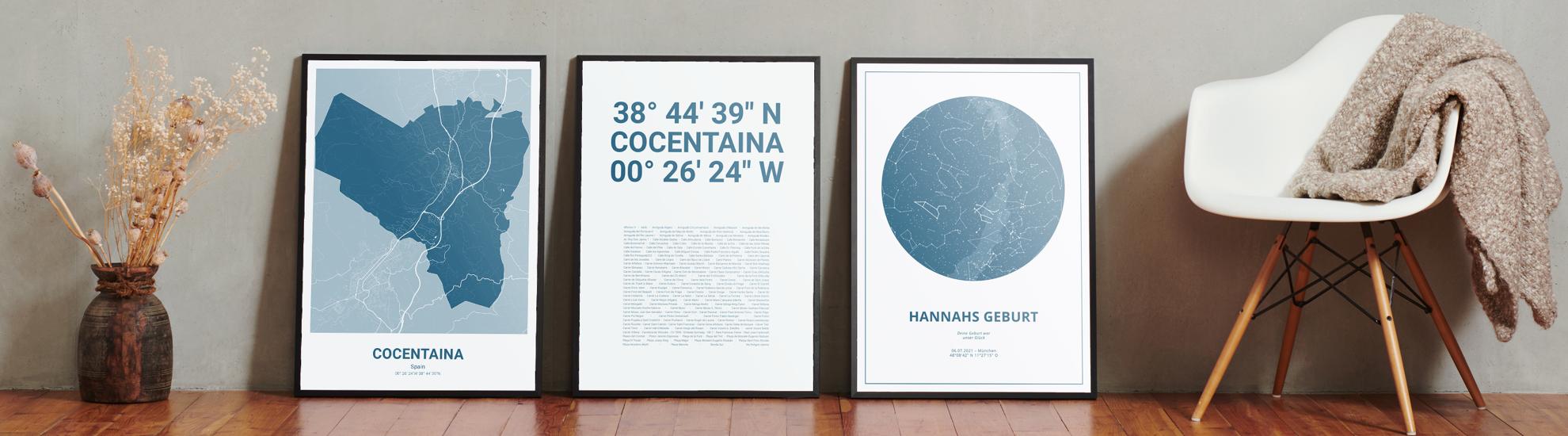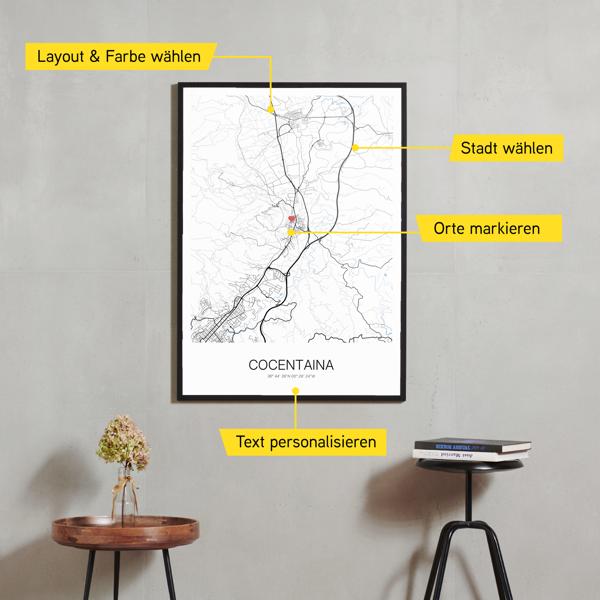 Wähle Farben und Layouts, die perfekt zu dir passen. Ob als klassische Karte in schwarz-weiß oder in modernen Farben. Bei Cartida kannst du ein Design in deinen Lieblingsfarben wählen. Erstelle eine Variante von Cocentaina, die perfekt zu dir und deiner Wohnung passt.