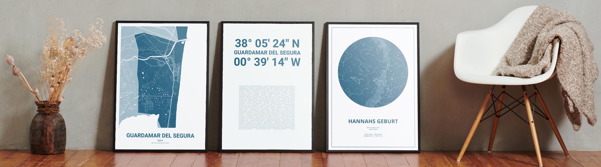 Zahlen, die die Welt bedeuten. Erstelle jetzt dein persönliches Koordinaten-Kunstwerk von deiner Lieblingsstadt. Entscheide selbst, ob Stadtteile, Straßen oder ganz eigene Texte abgedruckt werden. Perfekt als Geschenk zum Einzug oder für die eigenen vier Wände.