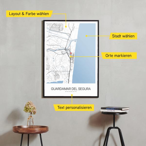 Wähle Farben und Layouts, die perfekt zu dir passen. Ob als klassische Karte in schwarz-weiß oder in modernen Farben. Bei Cartida kannst du ein Design in deinen Lieblingsfarben wählen. Erstelle eine Variante von Guardamar del Segura, die perfekt zu dir und deiner Wohnung passt.