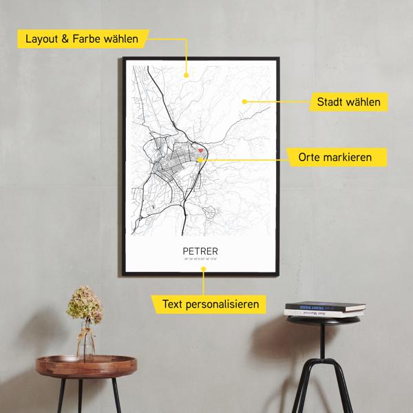 Wähle Farben und Layouts, die perfekt zu dir passen. Ob als klassische Karte in schwarz-weiß oder in modernen Farben. Bei Cartida kannst du ein Design in deinen Lieblingsfarben wählen. Erstelle eine Variante von Petrer, die perfekt zu dir und deiner Wohnung passt.