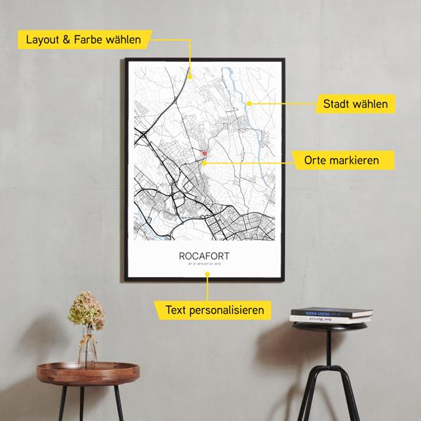 Wähle Farben und Layouts, die perfekt zu dir passen. Ob als klassische Karte in schwarz-weiß oder in modernen Farben. Bei Cartida kannst du ein Design in deinen Lieblingsfarben wählen. Erstelle eine Variante von Rocafort, die perfekt zu dir und deiner Wohnung passt.