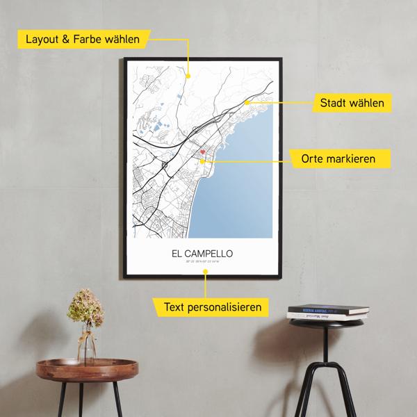 Wähle Farben und Layouts, die perfekt zu dir passen. Ob als klassische Karte in schwarz-weiß oder in modernen Farben. Bei Cartida kannst du ein Design in deinen Lieblingsfarben wählen. Erstelle eine Variante von el Campello, die perfekt zu dir und deiner Wohnung passt.