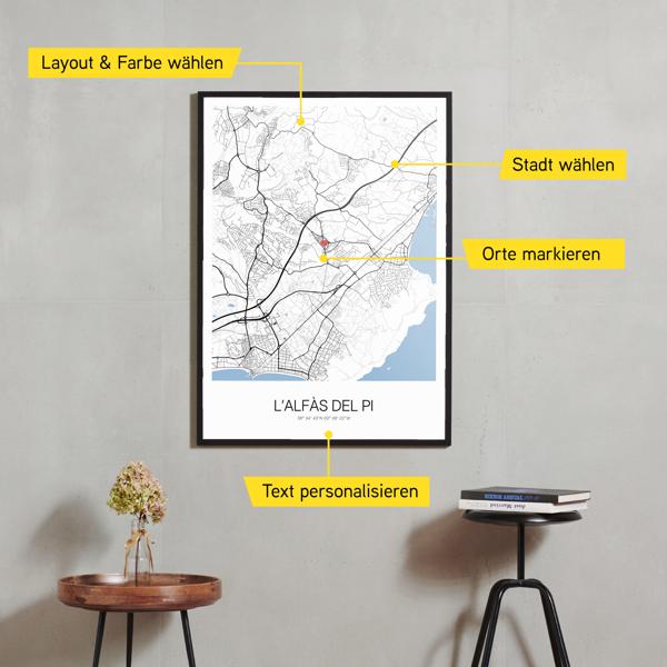 Wähle Farben und Layouts, die perfekt zu dir passen. Ob als klassische Karte in schwarz-weiß oder in modernen Farben. Bei Cartida kannst du ein Design in deinen Lieblingsfarben wählen. Erstelle eine Variante von l’Alfàs del Pi, die perfekt zu dir und deiner Wohnung passt.