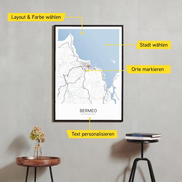 Wähle Farben und Layouts, die perfekt zu dir passen. Ob als klassische Karte in schwarz-weiß oder in modernen Farben. Bei Cartida kannst du ein Design in deinen Lieblingsfarben wählen. Erstelle eine Variante von Bermeo, die perfekt zu dir und deiner Wohnung passt.