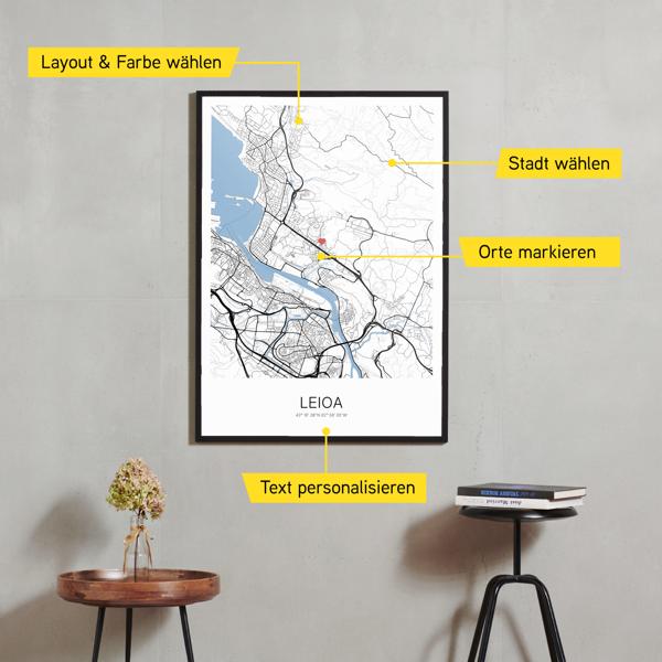 Wähle Farben und Layouts, die perfekt zu dir passen. Ob als klassische Karte in schwarz-weiß oder in modernen Farben. Bei Cartida kannst du ein Design in deinen Lieblingsfarben wählen. Erstelle eine Variante von Leioa, die perfekt zu dir und deiner Wohnung passt.