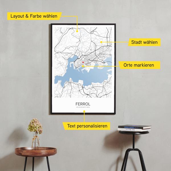 Wähle Farben und Layouts, die perfekt zu dir passen. Ob als klassische Karte in schwarz-weiß oder in modernen Farben. Bei Cartida kannst du ein Design in deinen Lieblingsfarben wählen. Erstelle eine Variante von Ferrol, die perfekt zu dir und deiner Wohnung passt.