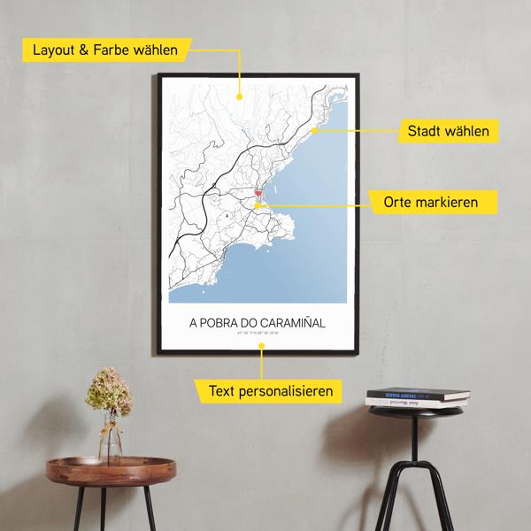 Wähle Farben und Layouts, die perfekt zu dir passen. Ob als klassische Karte in schwarz-weiß oder in modernen Farben. Bei Cartida kannst du ein Design in deinen Lieblingsfarben wählen. Erstelle eine Variante von A Pobra do Caramiñal, die perfekt zu dir und deiner Wohnung passt.