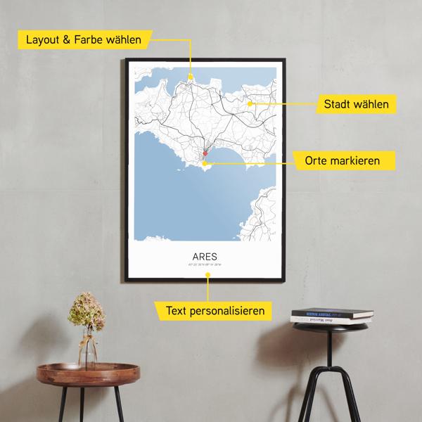Wähle Farben und Layouts, die perfekt zu dir passen. Ob als klassische Karte in schwarz-weiß oder in modernen Farben. Bei Cartida kannst du ein Design in deinen Lieblingsfarben wählen. Erstelle eine Variante von Ares, die perfekt zu dir und deiner Wohnung passt.