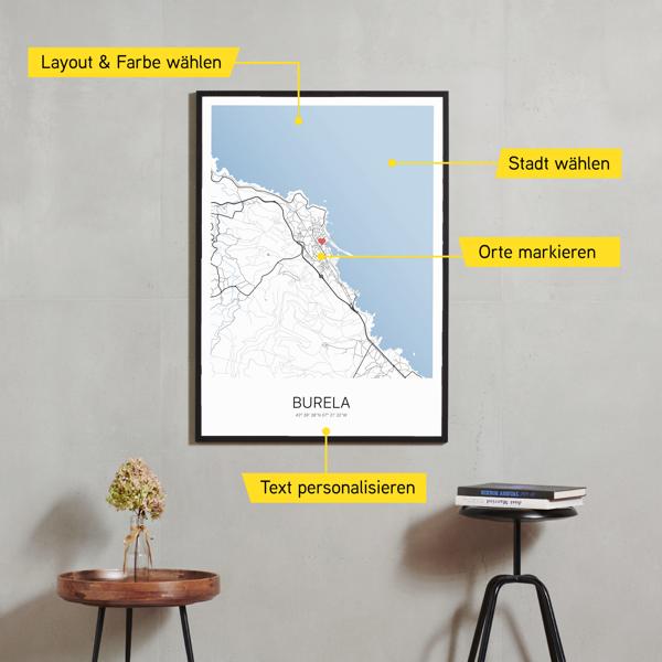 Wähle Farben und Layouts, die perfekt zu dir passen. Ob als klassische Karte in schwarz-weiß oder in modernen Farben. Bei Cartida kannst du ein Design in deinen Lieblingsfarben wählen. Erstelle eine Variante von Burela, die perfekt zu dir und deiner Wohnung passt.