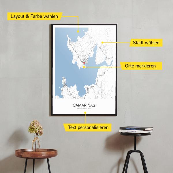 Wähle Farben und Layouts, die perfekt zu dir passen. Ob als klassische Karte in schwarz-weiß oder in modernen Farben. Bei Cartida kannst du ein Design in deinen Lieblingsfarben wählen. Erstelle eine Variante von Camariñas, die perfekt zu dir und deiner Wohnung passt.