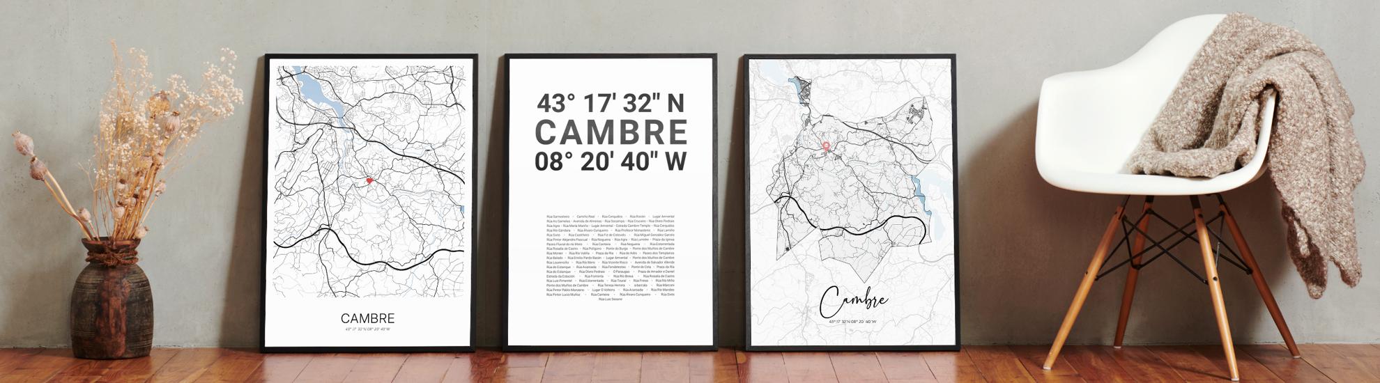 Bilder, die Geschichten erzählen über Reisen, Liebe und Erinnerungen. Wir bei Cartida haben deine Stadtkarte von Cambre in Galicia, Spanien. Dargestellt als Schwarzplan mit Gebäuden oder als Minimal City Map mit filigranen Straßennetz.