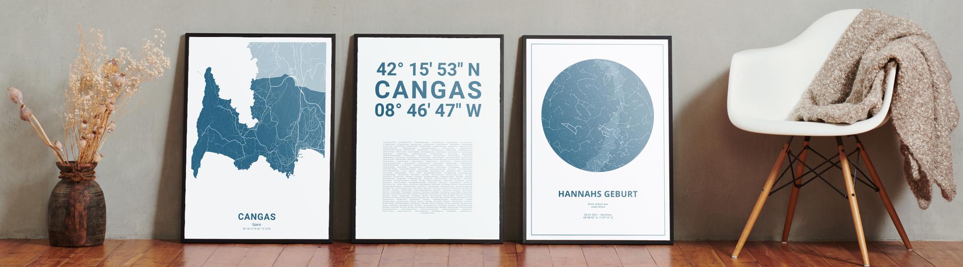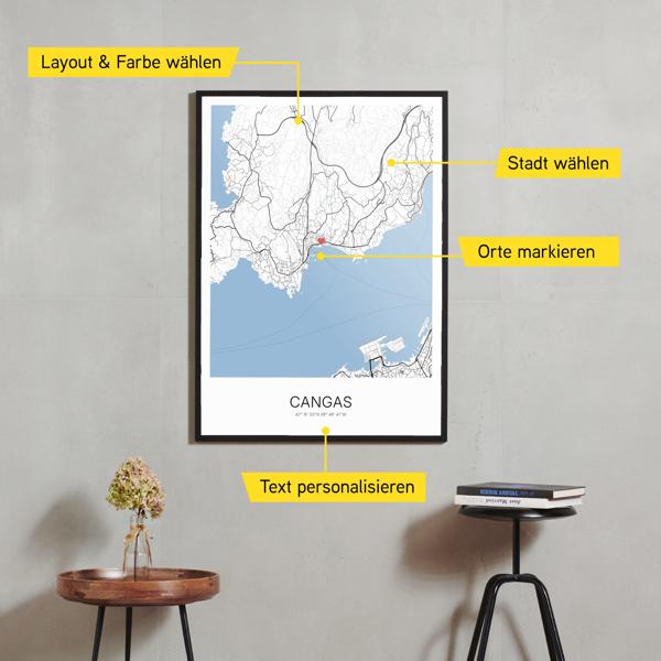 Wähle Farben und Layouts, die perfekt zu dir passen. Ob als klassische Karte in schwarz-weiß oder in modernen Farben. Bei Cartida kannst du ein Design in deinen Lieblingsfarben wählen. Erstelle eine Variante von Cangas, die perfekt zu dir und deiner Wohnung passt.