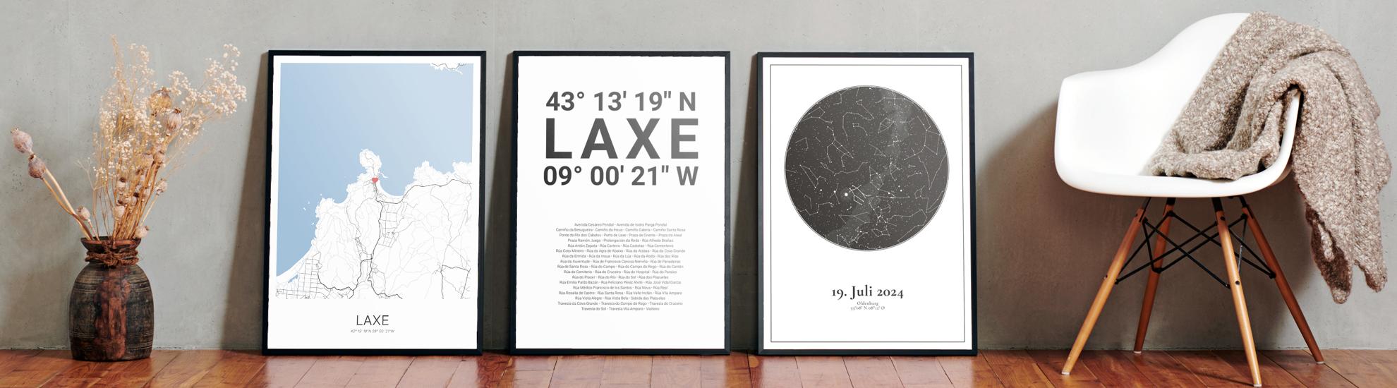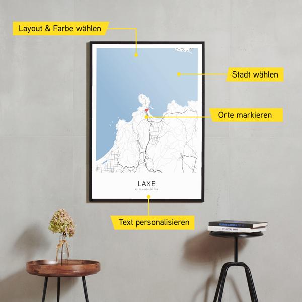 Wähle Farben und Layouts, die perfekt zu dir passen. Ob als klassische Karte in schwarz-weiß oder in modernen Farben. Bei Cartida kannst du ein Design in deinen Lieblingsfarben wählen. Erstelle eine Variante von Laxe, die perfekt zu dir und deiner Wohnung passt.