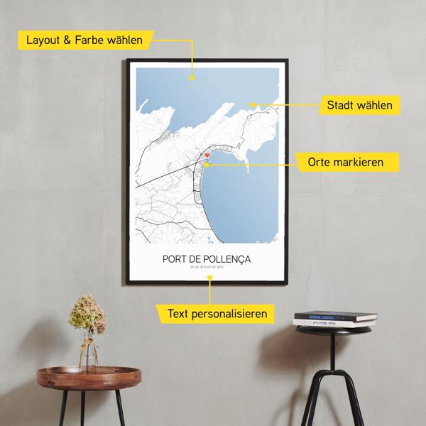 Wähle Farben und Layouts, die perfekt zu dir passen. Ob als klassische Karte in schwarz-weiß oder in modernen Farben. Bei Cartida kannst du ein Design in deinen Lieblingsfarben wählen. Erstelle eine Variante von Port de Pollença, die perfekt zu dir und deiner Wohnung passt.