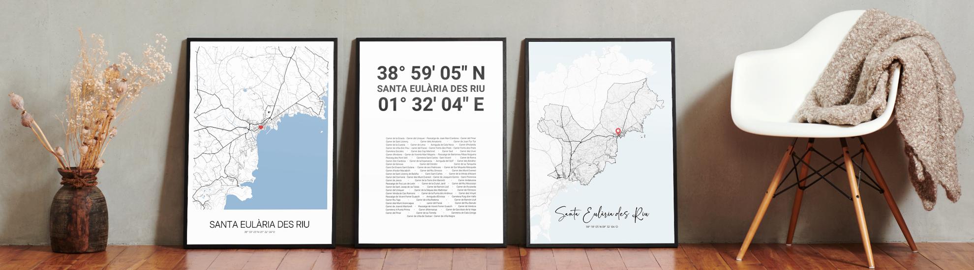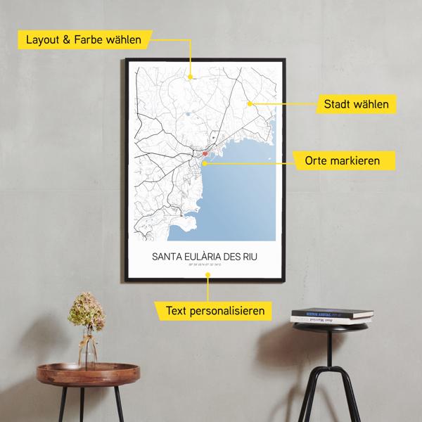 Wähle Farben und Layouts, die perfekt zu dir passen. Ob als klassische Karte in schwarz-weiß oder in modernen Farben. Bei Cartida kannst du ein Design in deinen Lieblingsfarben wählen. Erstelle eine Variante von Santa Eulària des Riu, die perfekt zu dir und deiner Wohnung passt.