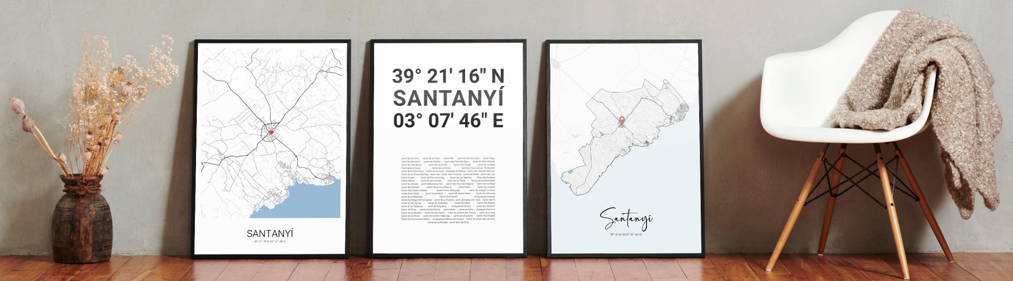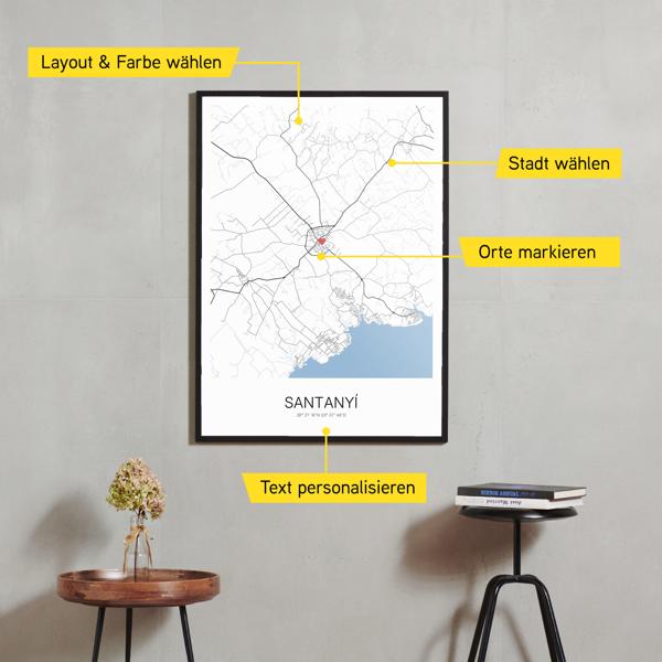 Wähle Farben und Layouts, die perfekt zu dir passen. Ob als klassische Karte in schwarz-weiß oder in modernen Farben. Bei Cartida kannst du ein Design in deinen Lieblingsfarben wählen. Erstelle eine Variante von Santanyí, die perfekt zu dir und deiner Wohnung passt.