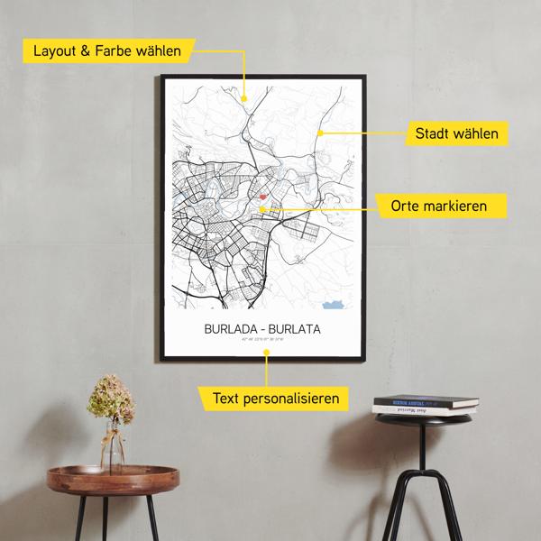 Wähle Farben und Layouts, die perfekt zu dir passen. Ob als klassische Karte in schwarz-weiß oder in modernen Farben. Bei Cartida kannst du ein Design in deinen Lieblingsfarben wählen. Erstelle eine Variante von Burlada - Burlata, die perfekt zu dir und deiner Wohnung passt.