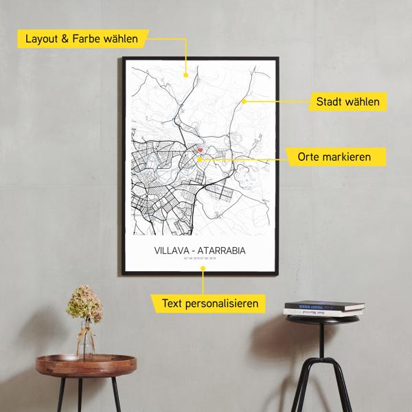 Wähle Farben und Layouts, die perfekt zu dir passen. Ob als klassische Karte in schwarz-weiß oder in modernen Farben. Bei Cartida kannst du ein Design in deinen Lieblingsfarben wählen. Erstelle eine Variante von Villava - Atarrabia, die perfekt zu dir und deiner Wohnung passt.