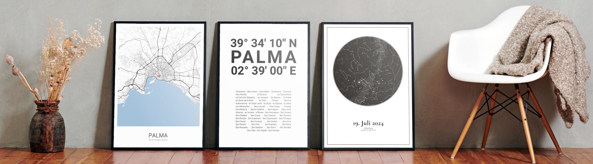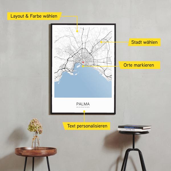 Wähle Farben und Layouts, die perfekt zu dir passen. Ob als klassische Karte in schwarz-weiß oder in modernen Farben. Bei Cartida kannst du ein Design in deinen Lieblingsfarben wählen. Erstelle eine Variante von Palma, die perfekt zu dir und deiner Wohnung passt.