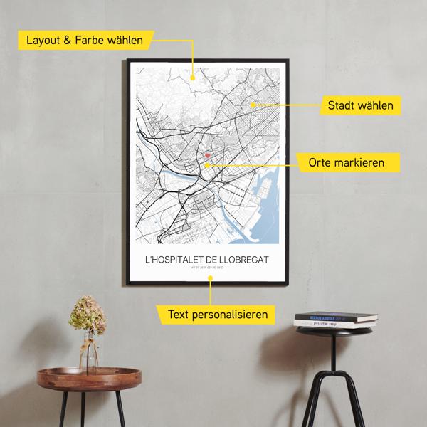 Wähle Farben und Layouts, die perfekt zu dir passen. Ob als klassische Karte in schwarz-weiß oder in modernen Farben. Bei Cartida kannst du ein Design in deinen Lieblingsfarben wählen. Erstelle eine Variante von l'Hospitalet de Llobregat, die perfekt zu dir und deiner Wohnung passt.