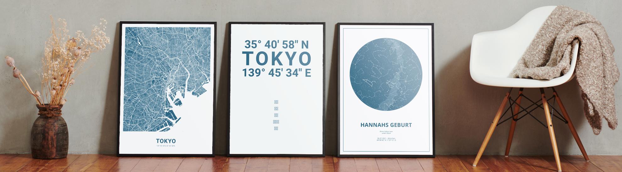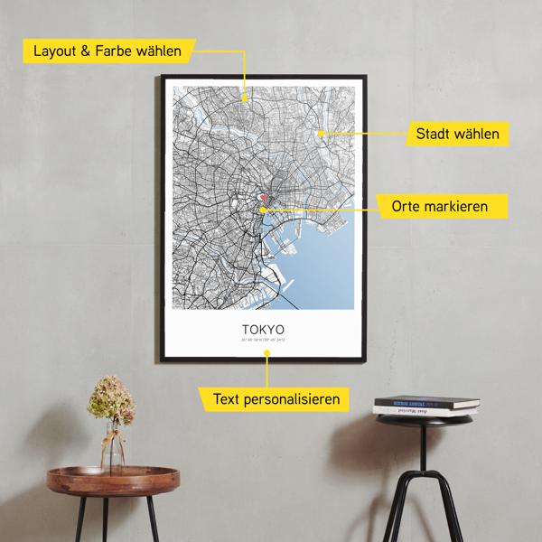 Wähle Farben und Layouts, die perfekt zu dir passen. Ob als klassische Karte in schwarz-weiß oder in modernen Farben. Bei Cartida kannst du ein Design in deinen Lieblingsfarben wählen. Erstelle eine Variante von Tokyo, die perfekt zu dir und deiner Wohnung passt.