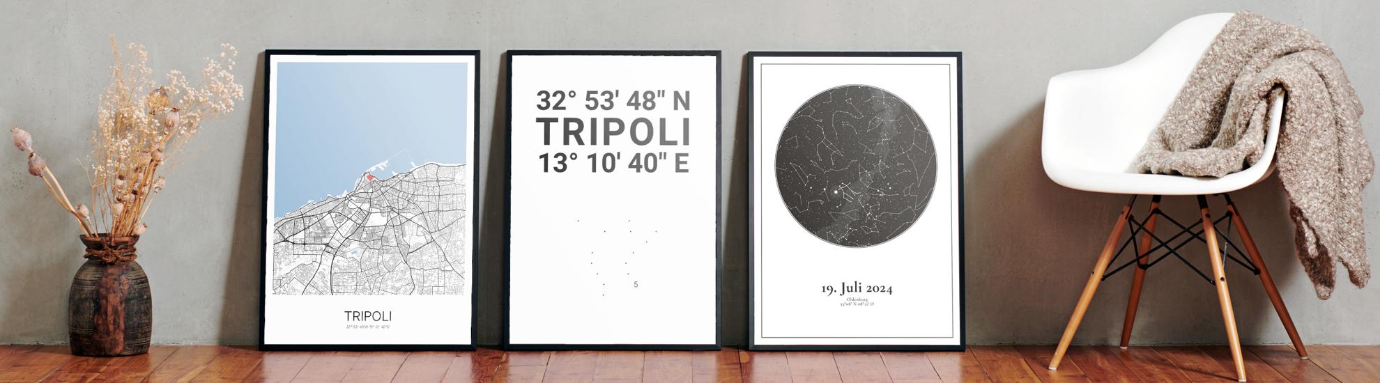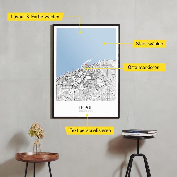 Wähle Farben und Layouts, die perfekt zu dir passen. Ob als klassische Karte in schwarz-weiß oder in modernen Farben. Bei Cartida kannst du ein Design in deinen Lieblingsfarben wählen. Erstelle eine Variante von Tripoli, die perfekt zu dir und deiner Wohnung passt.