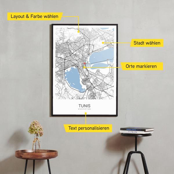 Wähle Farben und Layouts, die perfekt zu dir passen. Ob als klassische Karte in schwarz-weiß oder in modernen Farben. Bei Cartida kannst du ein Design in deinen Lieblingsfarben wählen. Erstelle eine Variante von Tunis, die perfekt zu dir und deiner Wohnung passt.