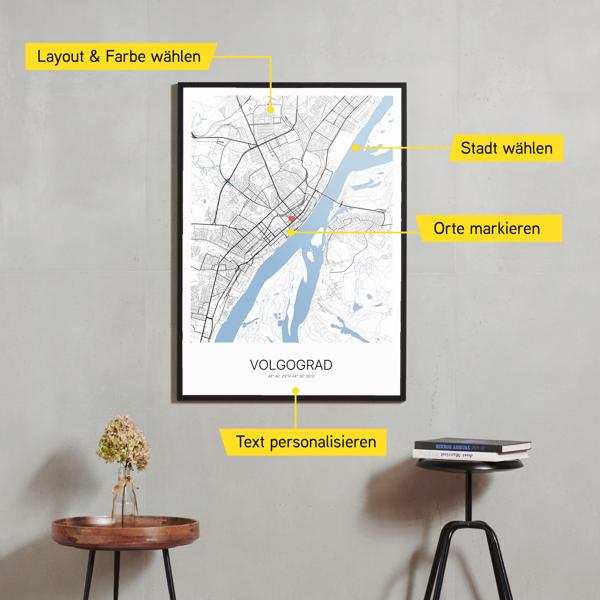 Wähle Farben und Layouts, die perfekt zu dir passen. Ob als klassische Karte in schwarz-weiß oder in modernen Farben. Bei Cartida kannst du ein Design in deinen Lieblingsfarben wählen. Erstelle eine Variante von Volgograd, die perfekt zu dir und deiner Wohnung passt.