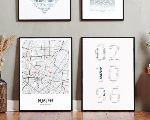 Gestalte ein besonderes Geburtstagsgeschenk: personalisierte Poster mit Stadtkarte, Sternenhimmel oder Koordinaten eines unvergesslichen Moments.