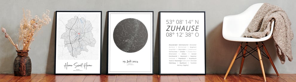 Zahlen, die die Welt bedeuten. Erstelle jetzt dein persönliches Koordinaten-Kunstwerk von deiner Lieblingsstadt. Entscheide selbst, ob Stadtteile, Straßen oder ganz eigene Texte abgedruckt werden. Perfekt als Geschenk zum Einzug oder für die eigenen vier Wände.